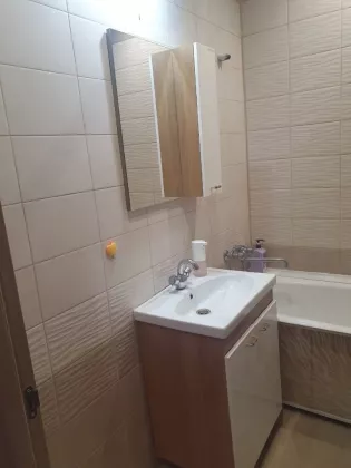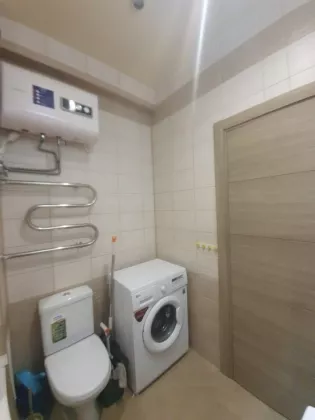 Санузел совмещен отделан керамической плиткой, установлено дорогостоящее сантехническое оборудование , стиральная машина, электротитан, приборы учета на ГВС и ХВС, горячая вода в отопительный период.